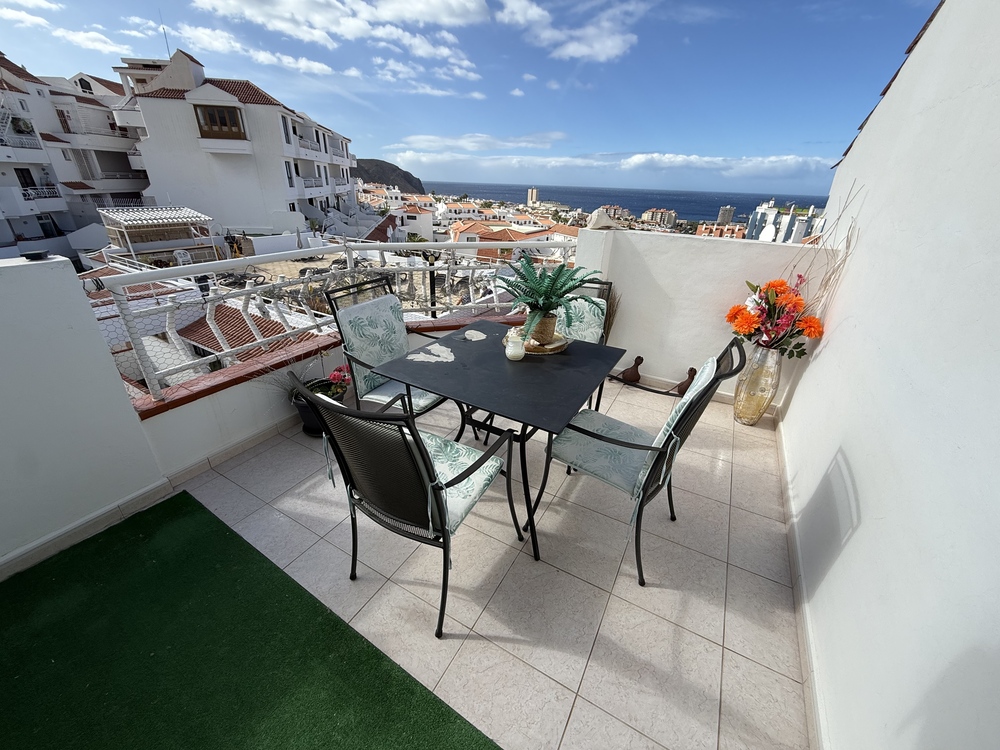 Stunning penthouse apartment of 1 bedroom in the lovely Los Diamantes III! Entering the apartment you are greeted with the bright and open living room which is of good size, directly flowing onto the 1st of 3 terraces. The kitchen is open and set towards the back of the room with fitted cupboards and a new ceramic hob. The first terrace opens up from the living room with an outdoor table , great for Al Fresco dining, and stunning views to the pool/sea. The bedroom is large, well-presented with storage and has direct access onto a private terrace. The bathroom is situated just round the corner, it is fitted with sleek tiles and a bathtub. In addition to the first two terraces there is also a fantastic roof terrace! Sunny, spacious and perfect for sunbathing, enjoying beautiful views towards the coast of Los Cristianos. Los Diamantes III is a popular complex in Los Cristianos with a communal pool, located in the heart of a busy town!